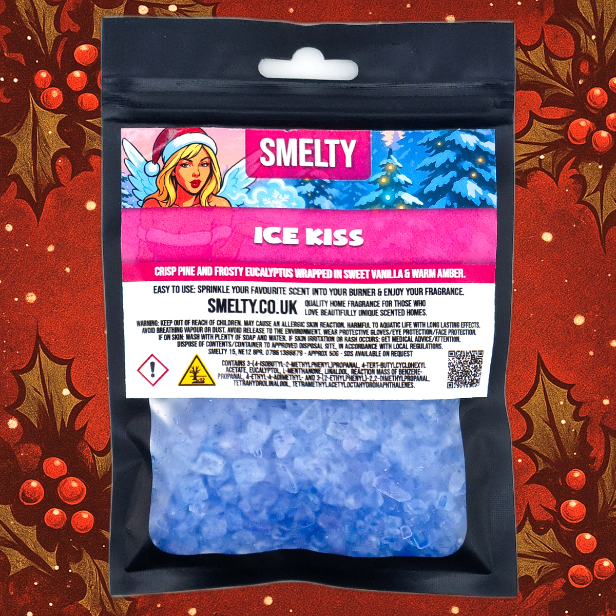 Scent Profile: A frosty breath of eucalyptus and mint meets snowy evergreen woods and crisp pine, like a winter walk at dusk. Soft hints of lavender and jasmine drift through the air before melting into a cosy base of caramel, creamy vanilla, warm tonka, coconut and amber musk. Fresh winter chill with a sweet comforting glow.